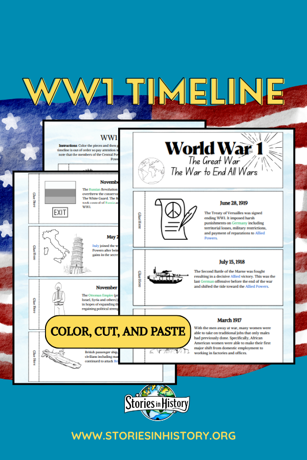 This timeline highlights the major events of World War One (WW1). Students will color each piece while reading about the key event and then glue it into the correct order on the timeline. The pieces are out of order so students will need to pay attention to the dates. Allied powers are highlighted in blue and Central powers are highlighted in green to make it easier to read and keep track of the story. There are 15 pieces in all (4 pages printed) so the timeline's length is approximately 7 feet long by 3" wide. You can fold these timelines up after and use them as a study tool or hang them on the walls. This is a simple way to review the key events of WWI.